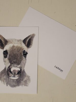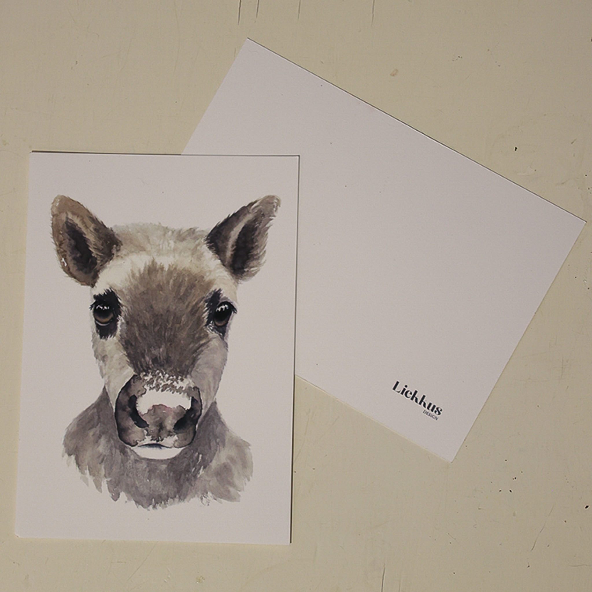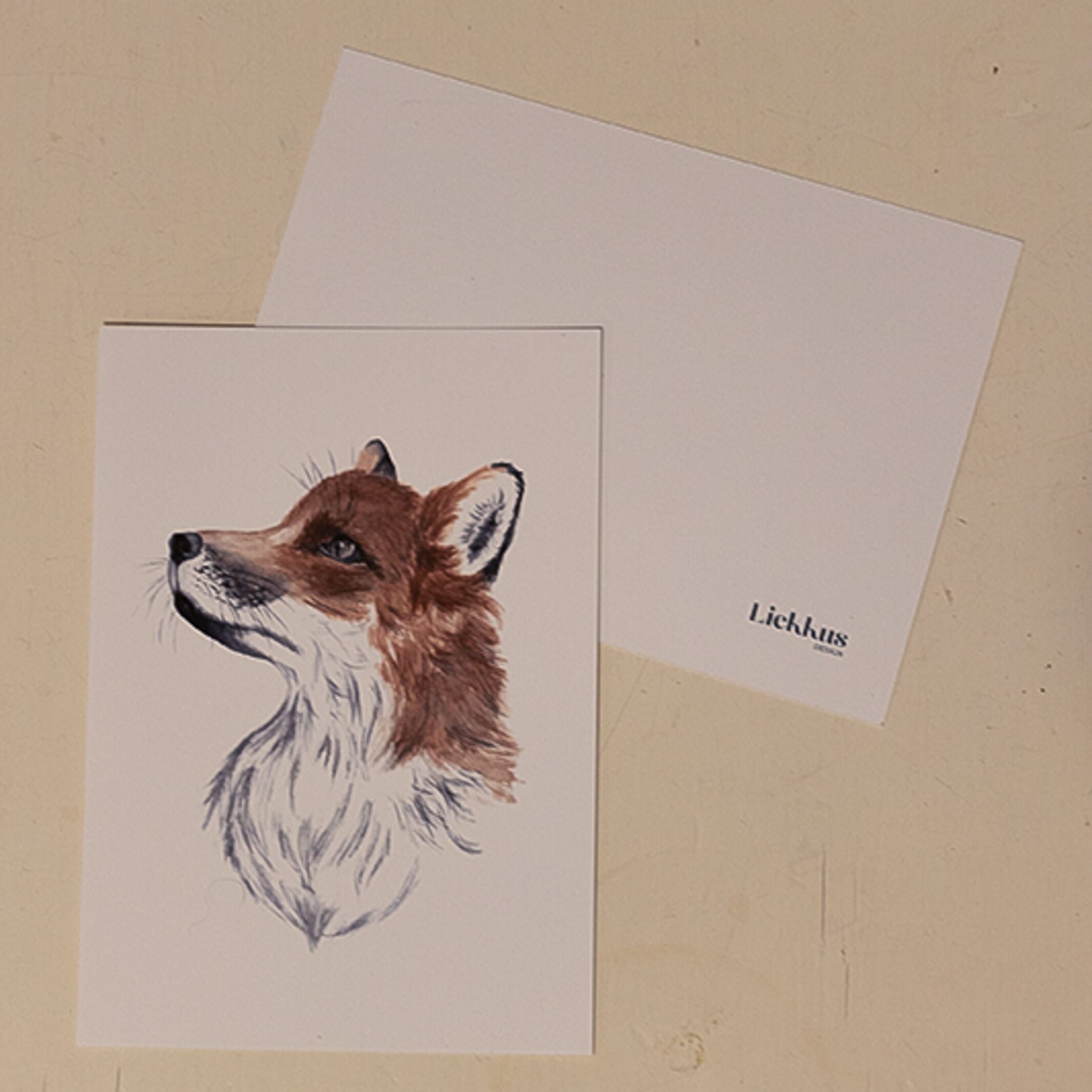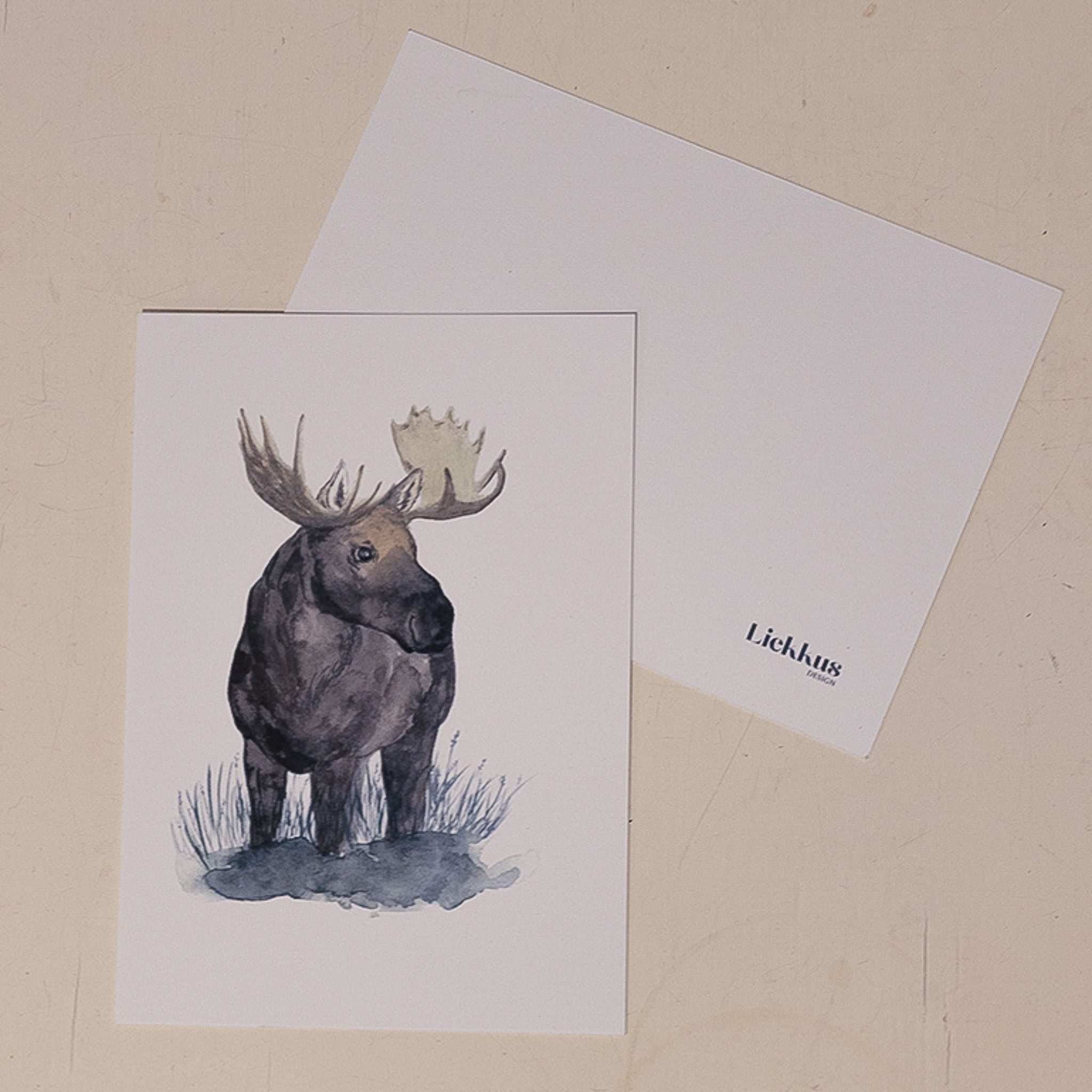 Koko 10cm x 15cm, ilman osoiterivejä. Takaa tyhjä valkoinen, pienellä Liekkus Design logolla.